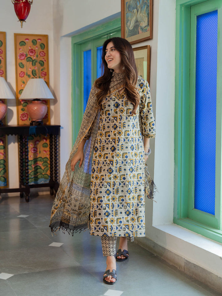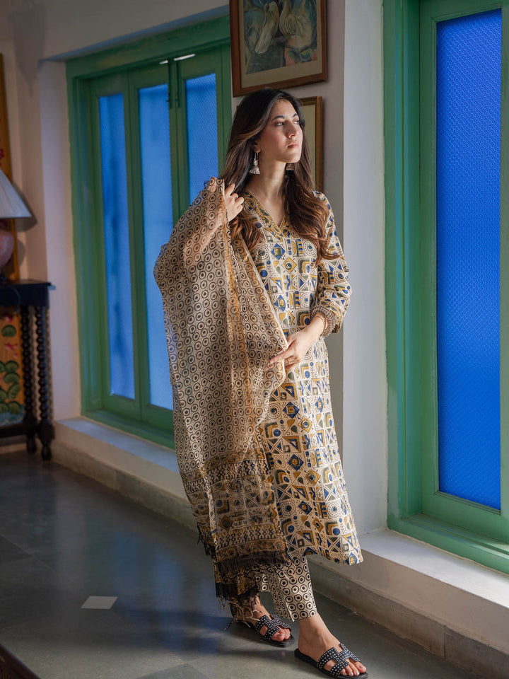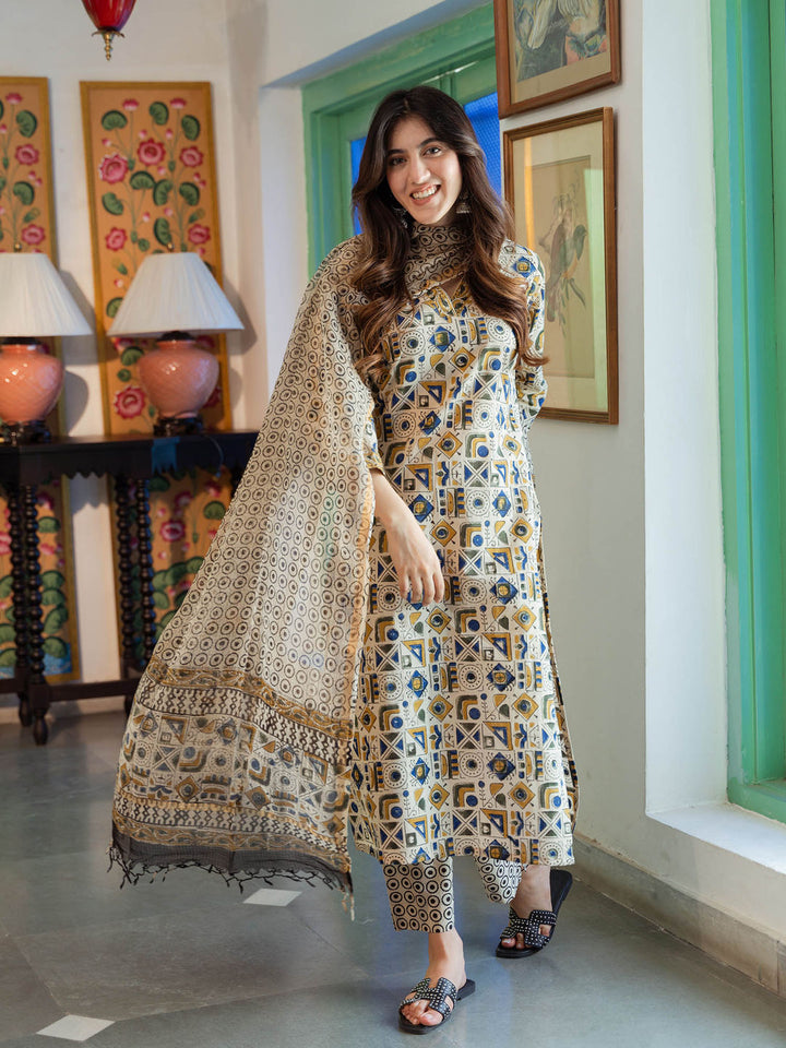 Beige Abstract Cotton Geometric Kurta with Pant & Dupatta (Set of 3)