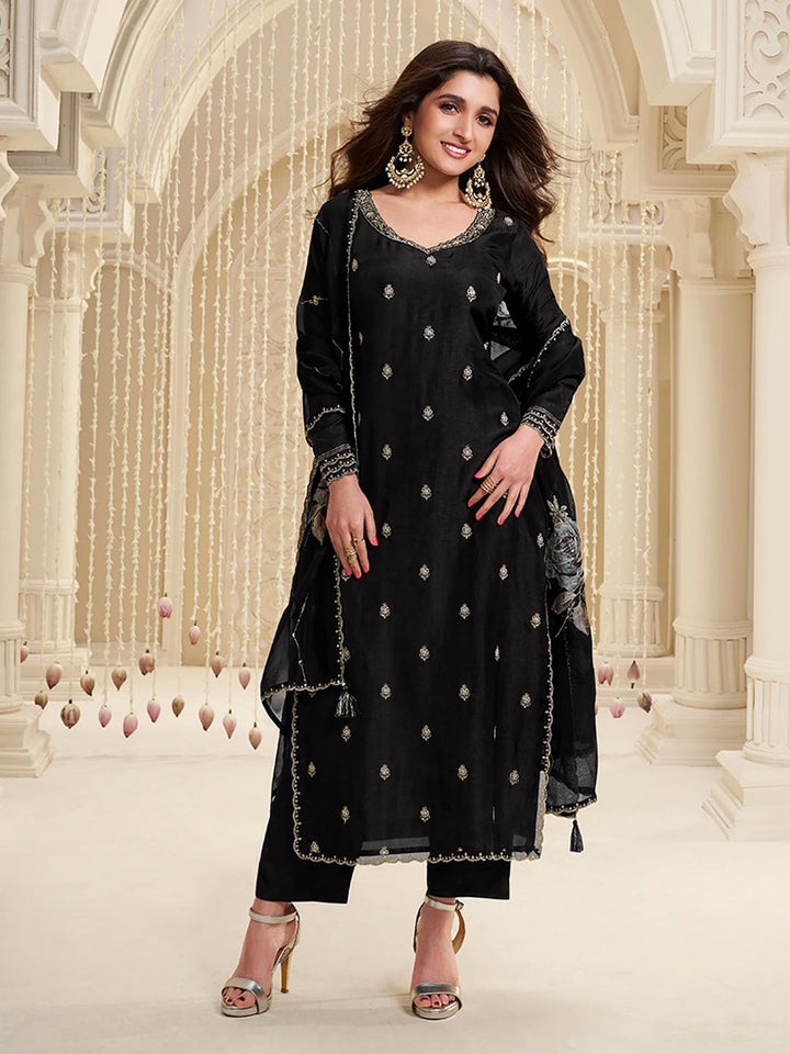 Black Embroidery Silk Straight Kurta with Pant and Dupatta (Set of 3)