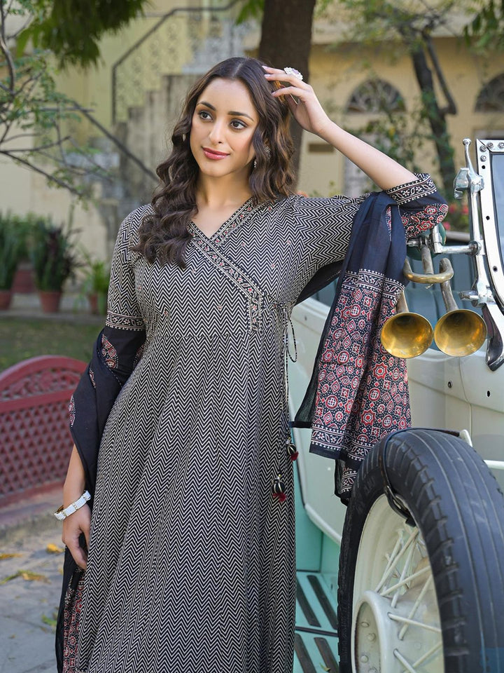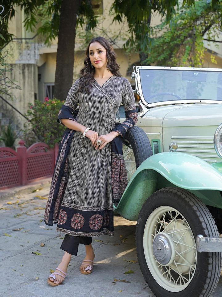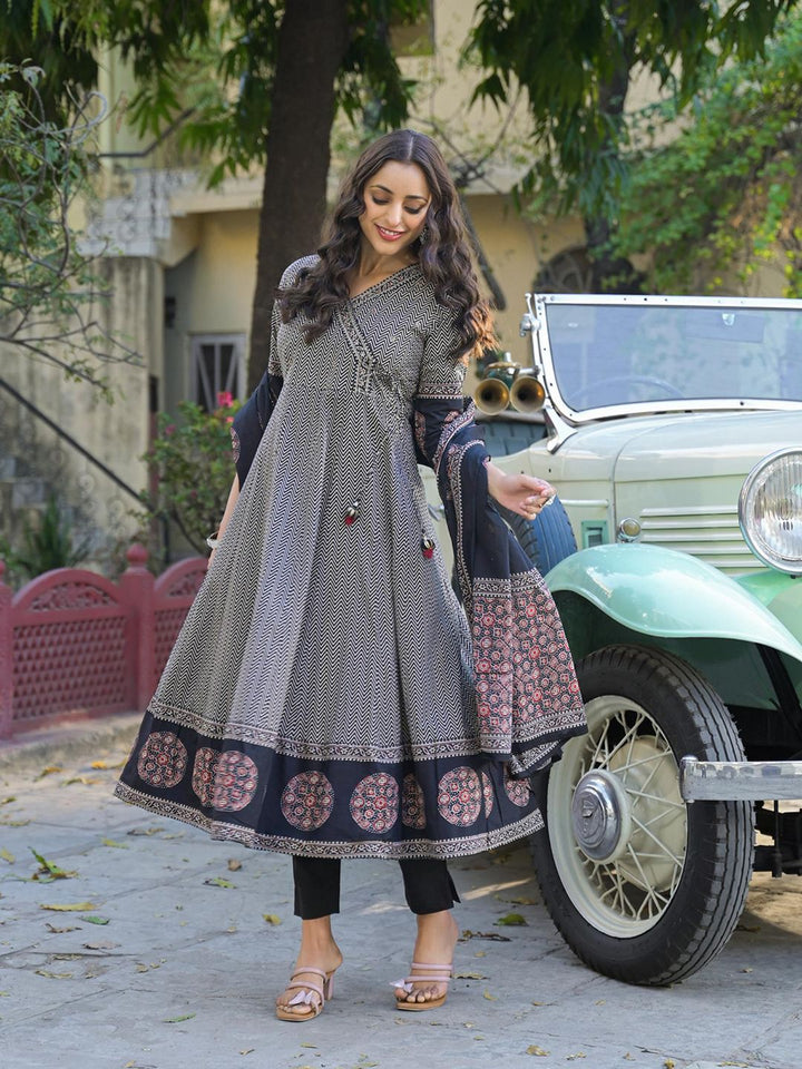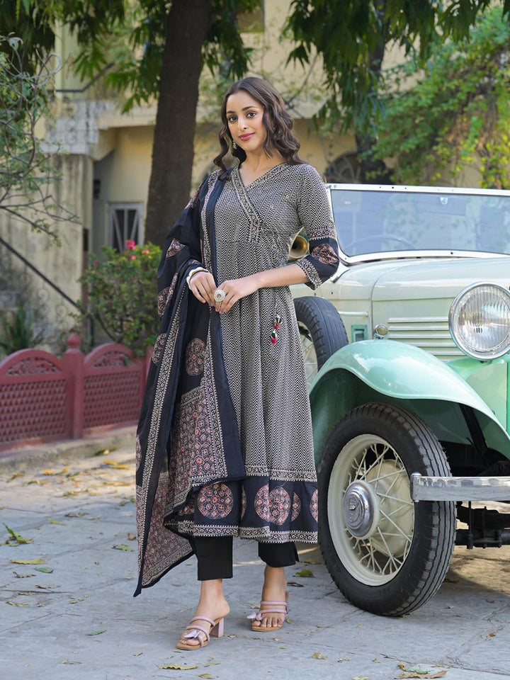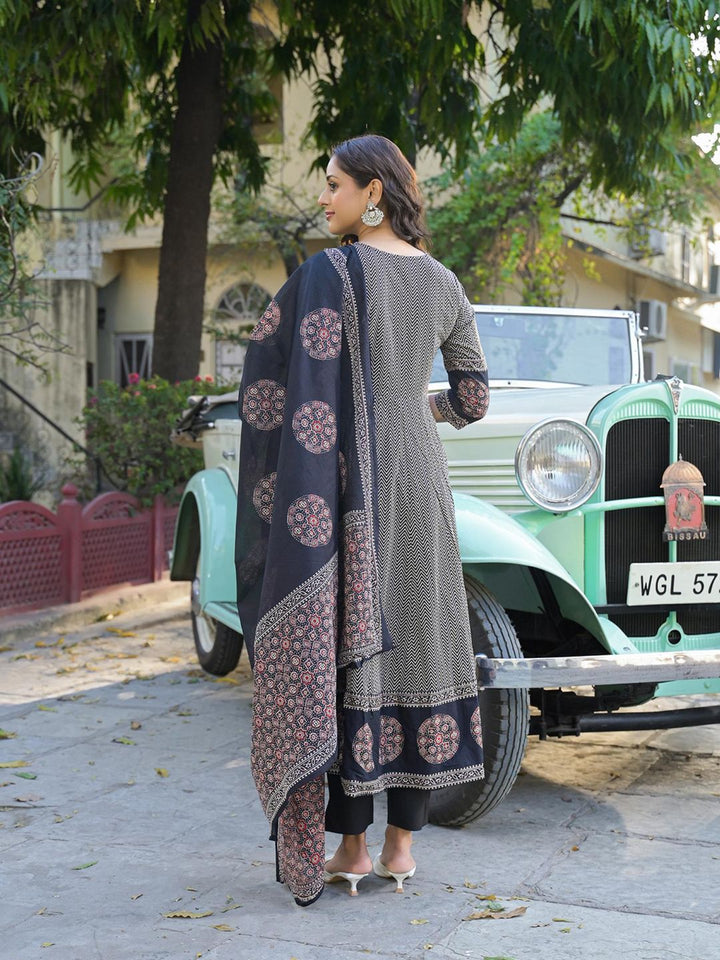 Black Printed Cotton Fabric Anarkali Kurta with Pant & Dupatta (Set of 3)