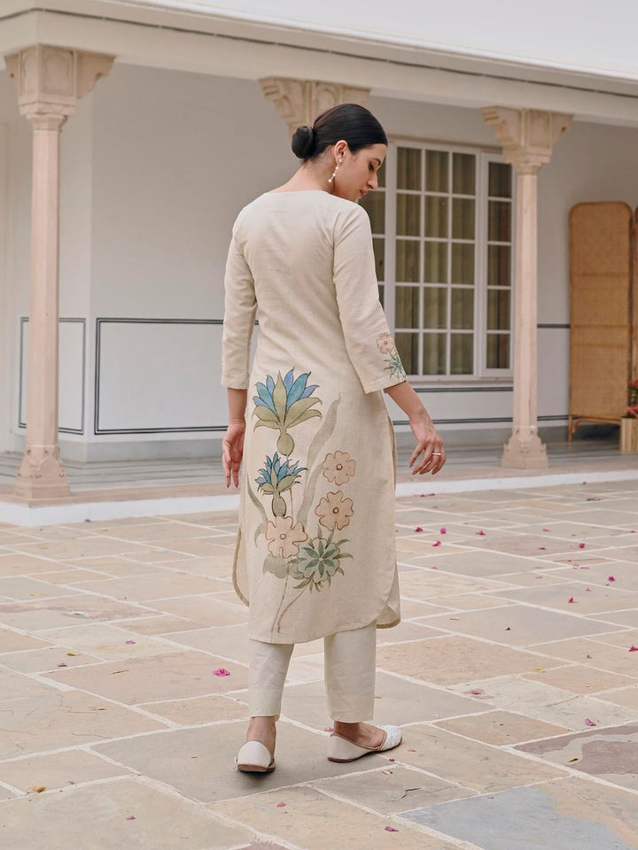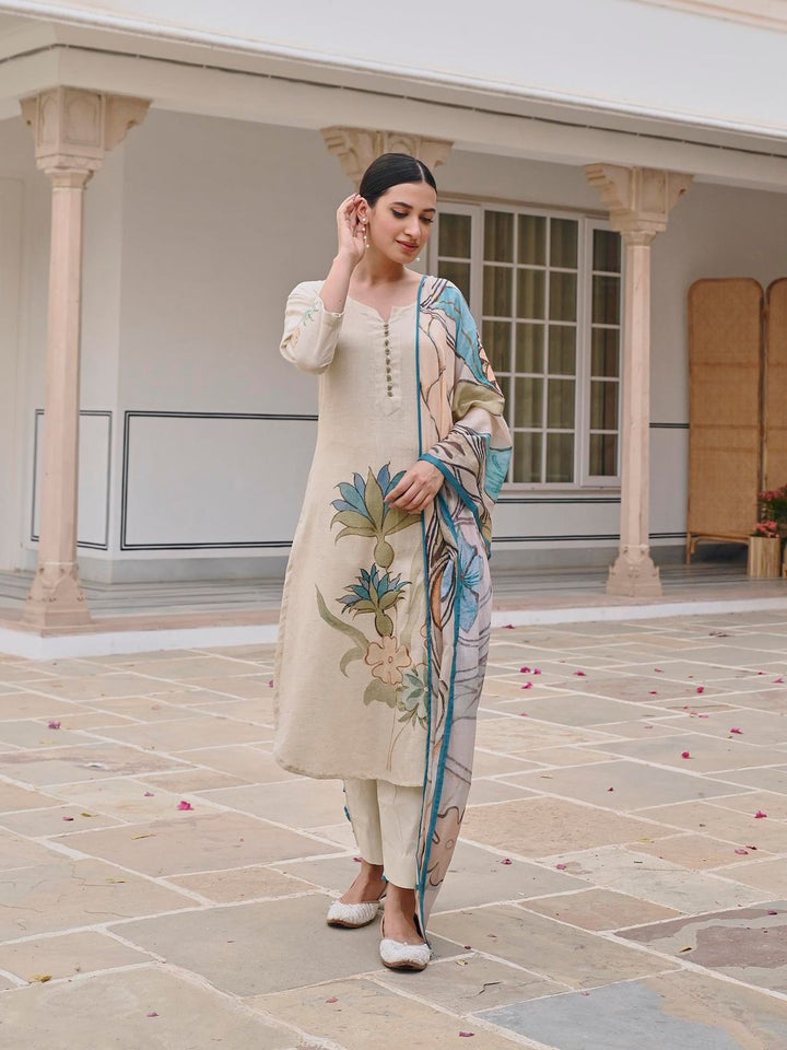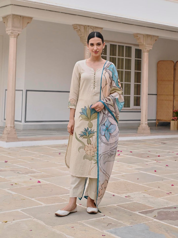 Blue Handloom Cotton Straight Kurta with Pant and Dupatta (Set of 3)