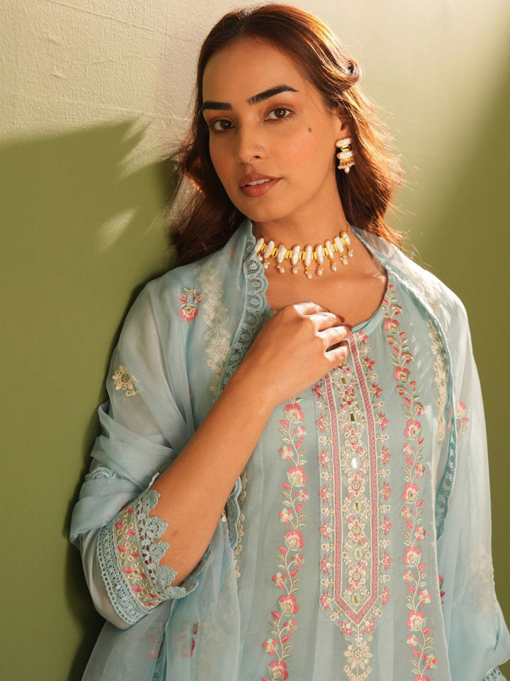 Floral Embroidered Organza A-Line Kurta With Trousers And Dupatta