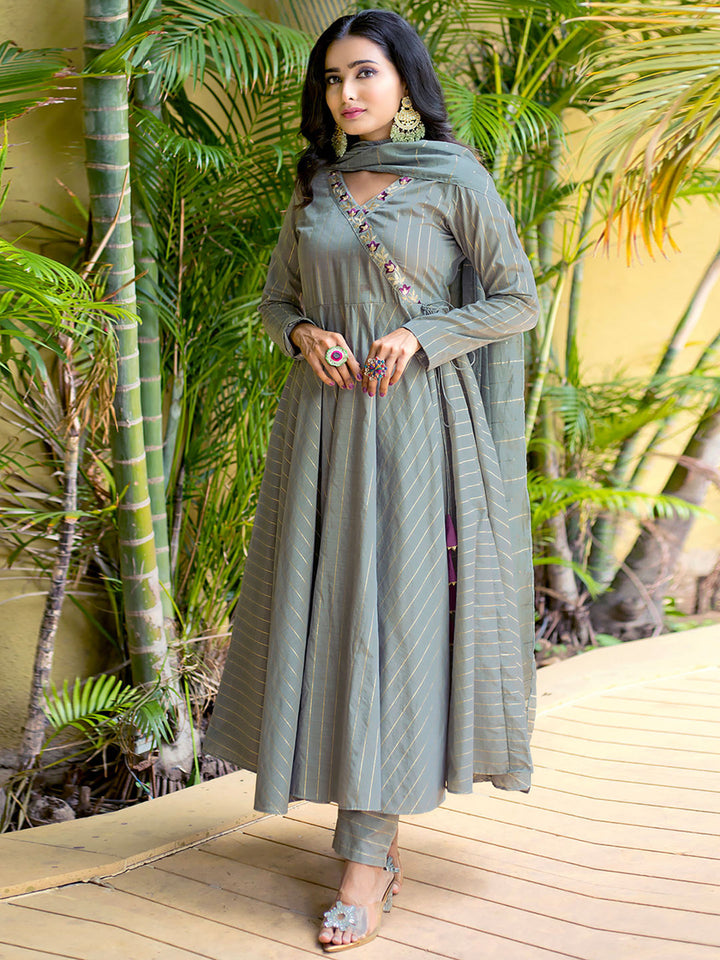 Grey Stripes Anarkali Kurta with Pant and Dupatta (Set of 3)