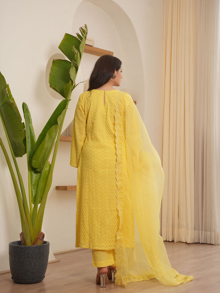 Josie Yellow Schiffli Straight Kurta with Pant and Dupatta (Set of 3)