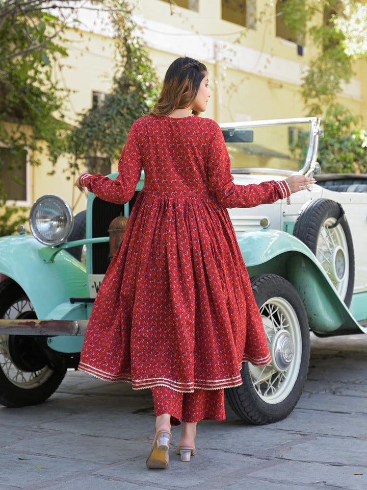 Red Floral Cotton Printed Anarkali Kurta with Pant and Dupatta (Set of 3)