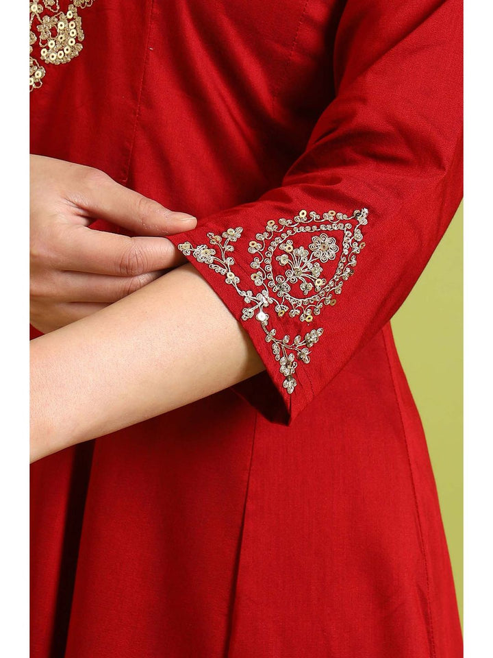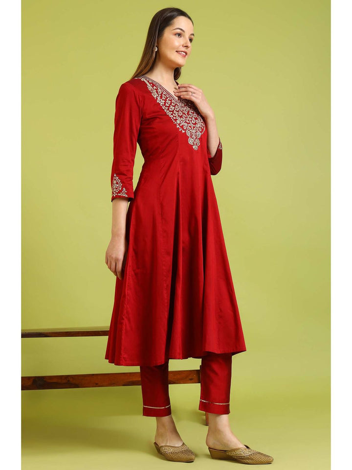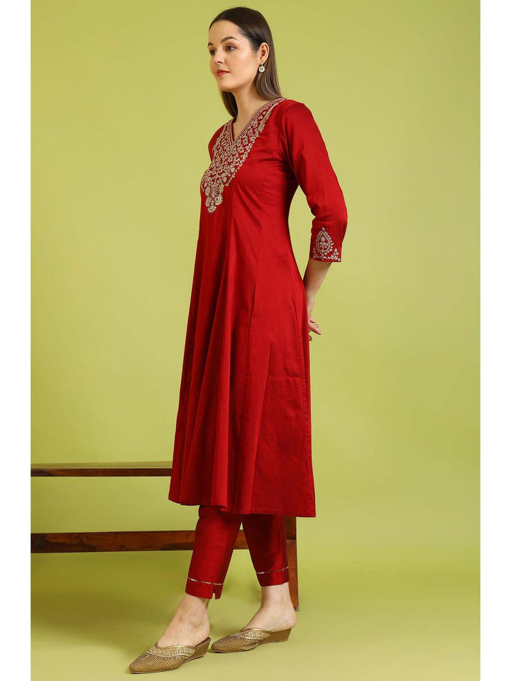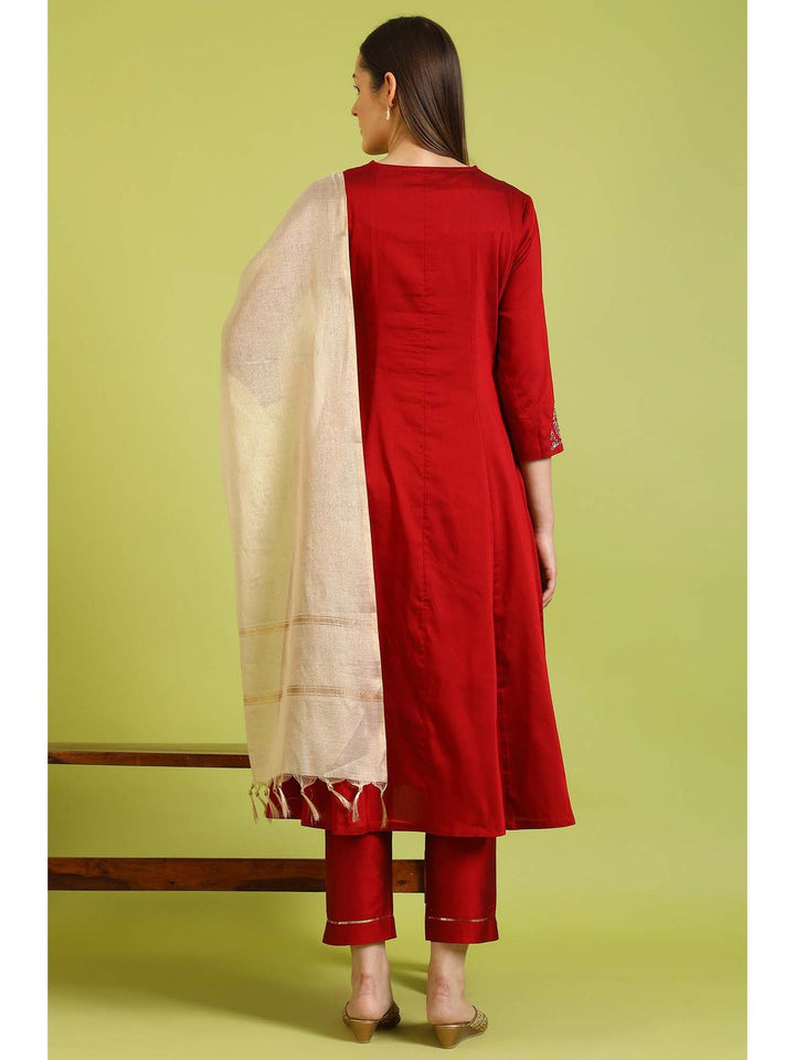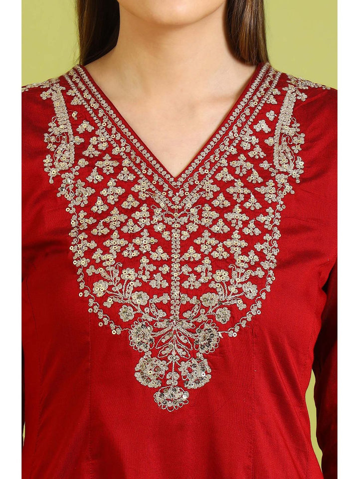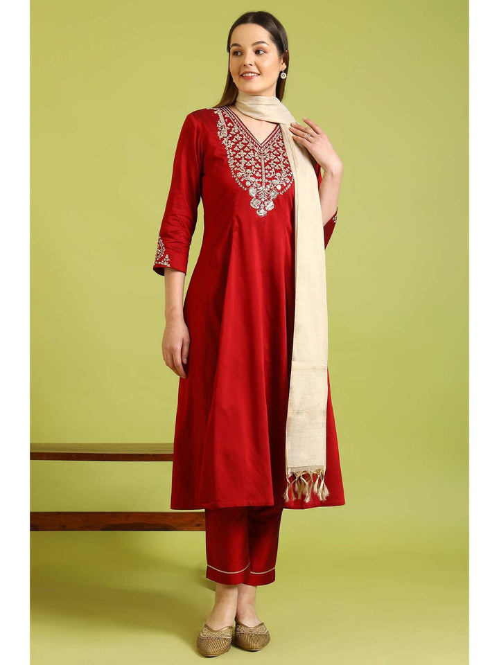 Red V-Neck Embroidered Kurta with Pant and Dupatta (Set of 3)