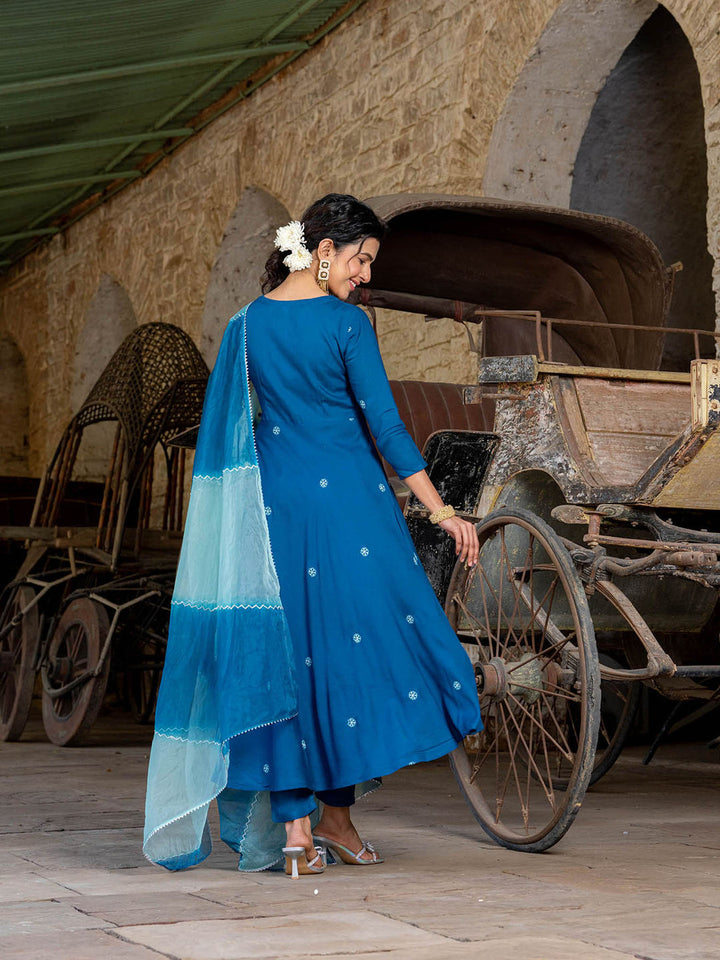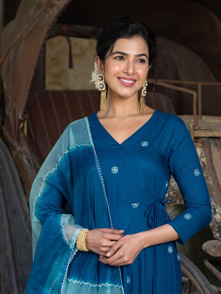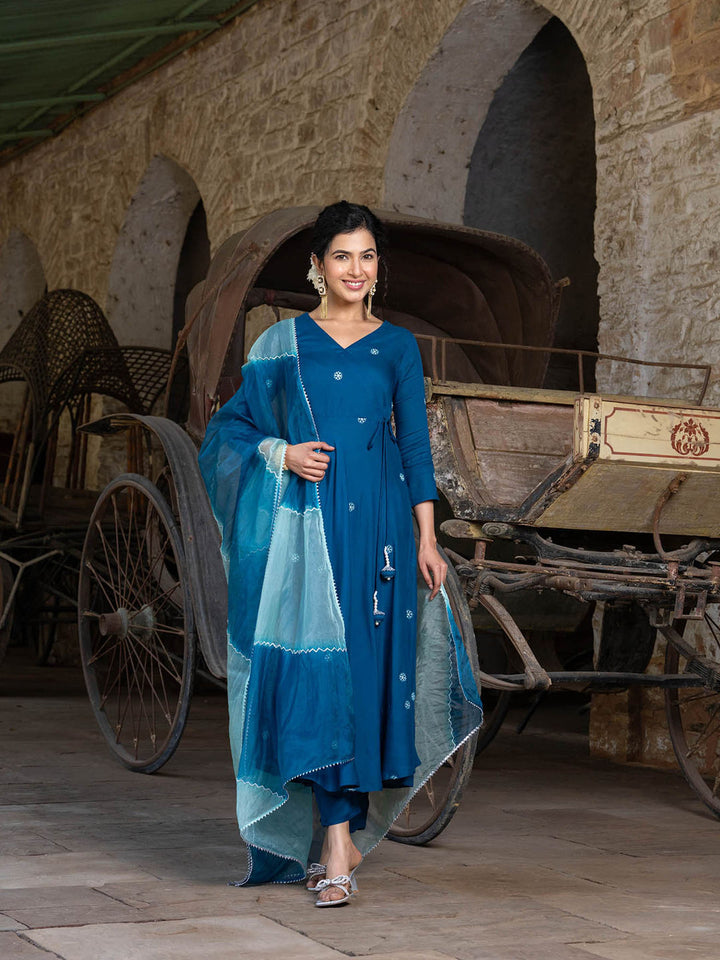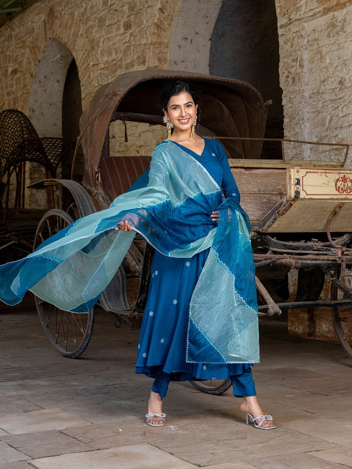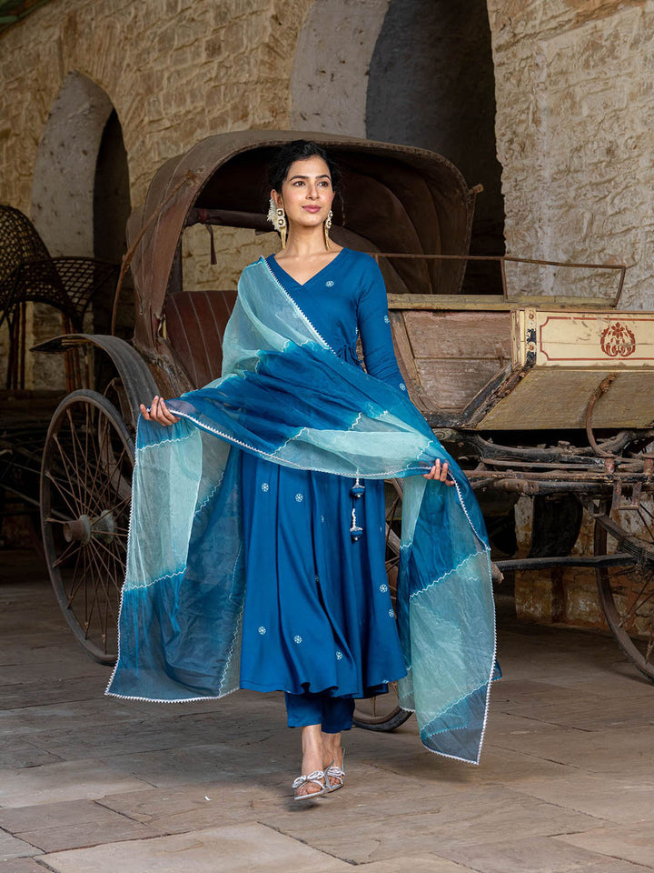 Teal Embroidered Handwork Angarkha Kurta With Pant & Dupatta (Set of 3)